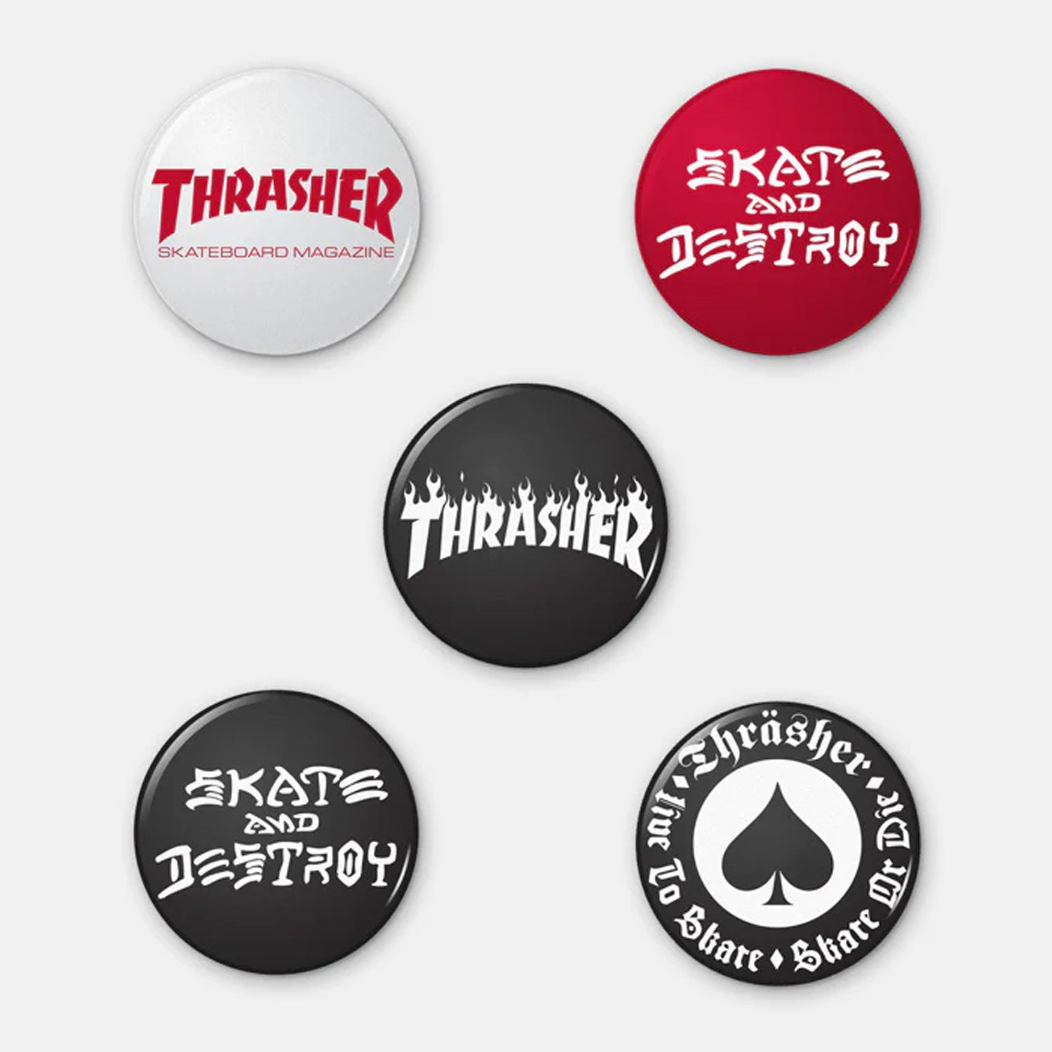 5 Pack of 1" plastic-coated buttons. Includes Flame logo, Skate and Destroy logo, Oath logo, Skate Mag logo, and Skate Goat logo.