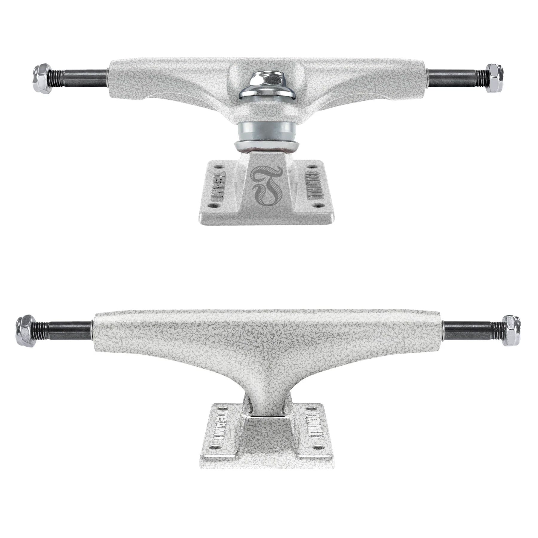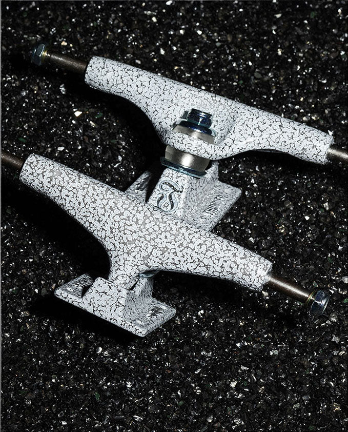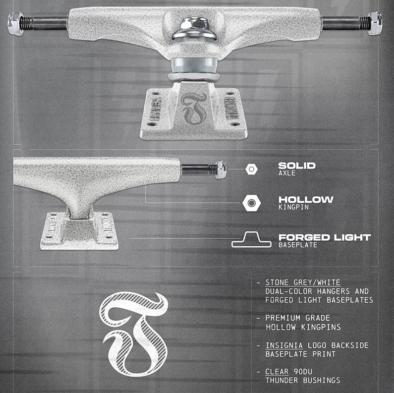 Thunder Pearl Lights. Stone Grey/White Dual-Color hangers and forged light baseplates. Less weight – more strength, premium grade hollow kingpins, extra strong axles, custom forged aluminum baseplates, lightning quick response & control. Hollow Kingpin. Solid Axle. Clear 90A Thunder Bushings. Thunder 147 = 8.0" Axle. Includes 2 Trucks.