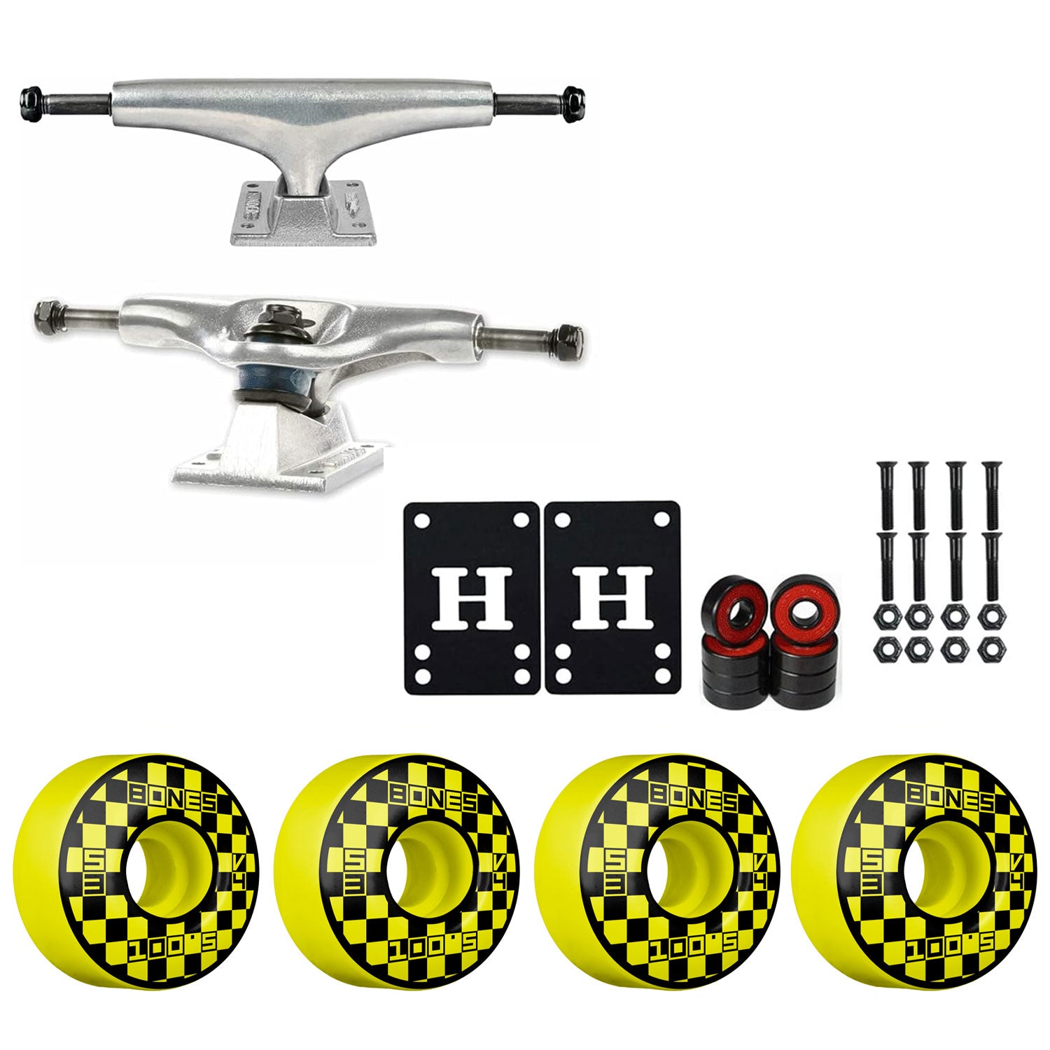This package contains everything you need to make your deck a complete. Includes a set of Standard Polished Thunder Trucks, Bones 100's Wheels, Amp Abec 5 Bearings, 1" Hardware, and 1/8" Riser pads. Just add a deck and griptape and you are ready to ride!