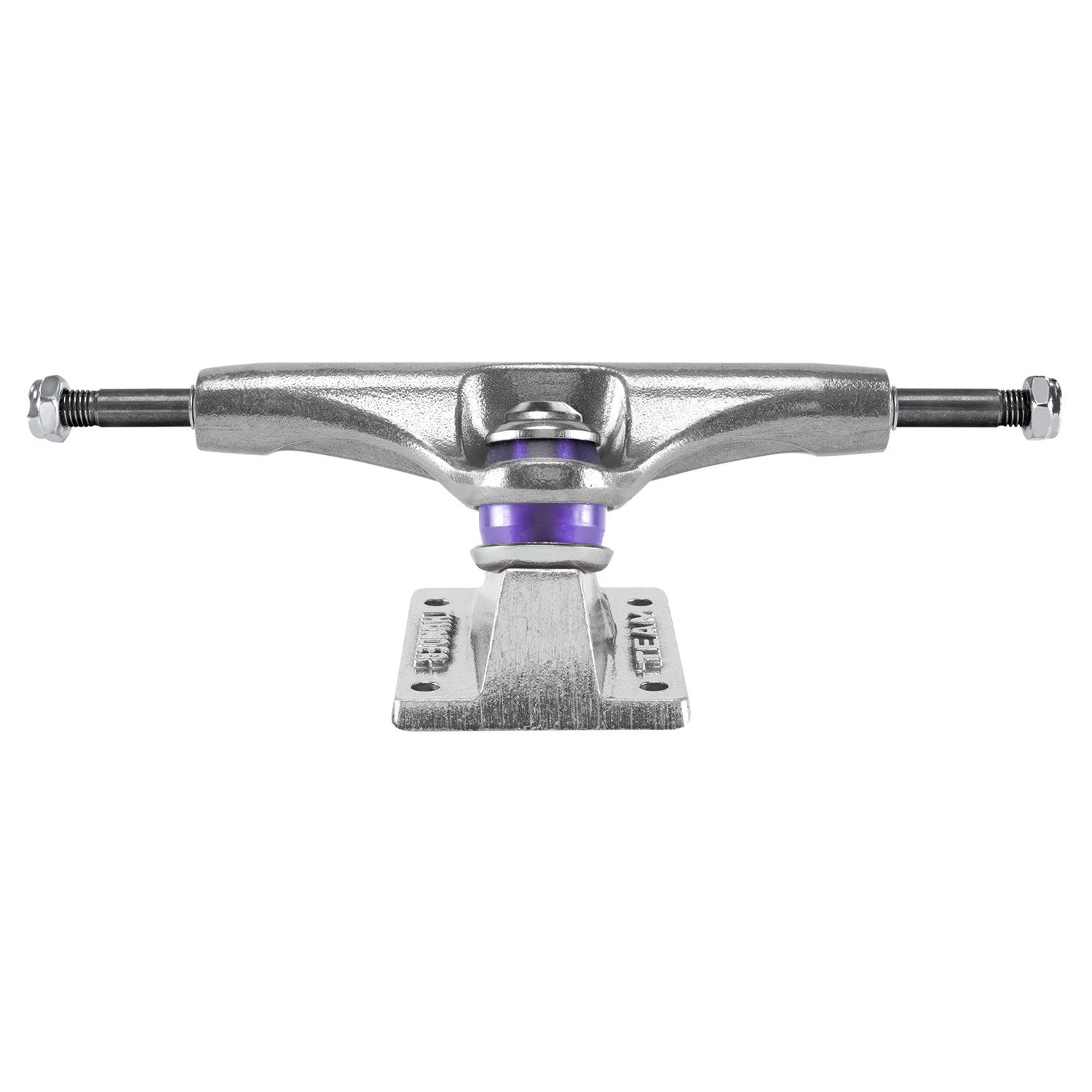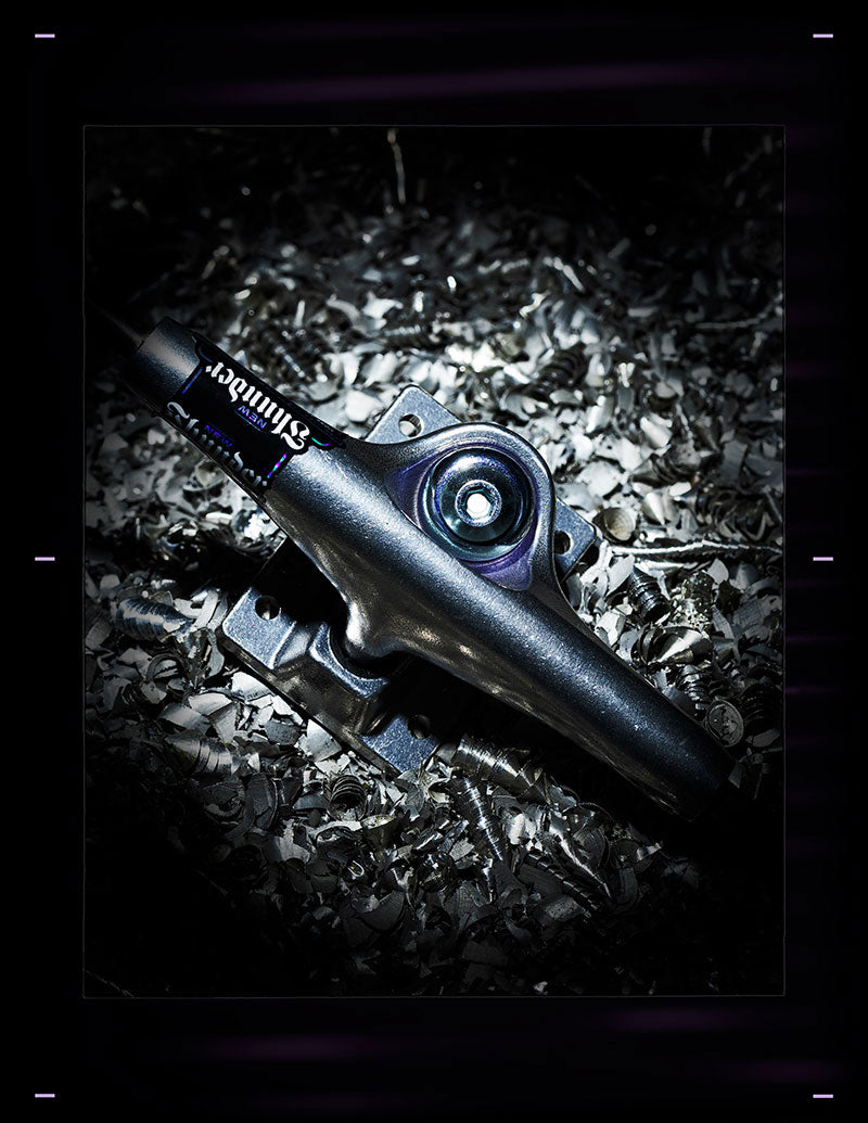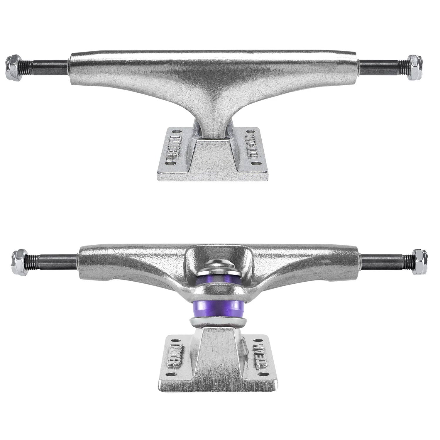 Thunder Inverted Edition Trucks feature team edition geometry for quick turn response, developed for those looking for more grind clearance and smoother slides. Features: Solid Axle Inverted Hollow Kingpin Exclusive low-profile kingpin head design without shark edges – no hanging up or catching on grinds. 45% more kingpin clearance than standard team editions Adjustable with 5.5mm or 7/32†allen key (compatible with Spitfire T3 tool). Updated baseplate design rounds off the corners and pivot housings for smoother nose and tail slides. Reinforced kingpin and pivot wall housings for increased strength and longer truck life 90A Durometer clear purple bushings and 100A Durometer pivot cups for fast break-in time.