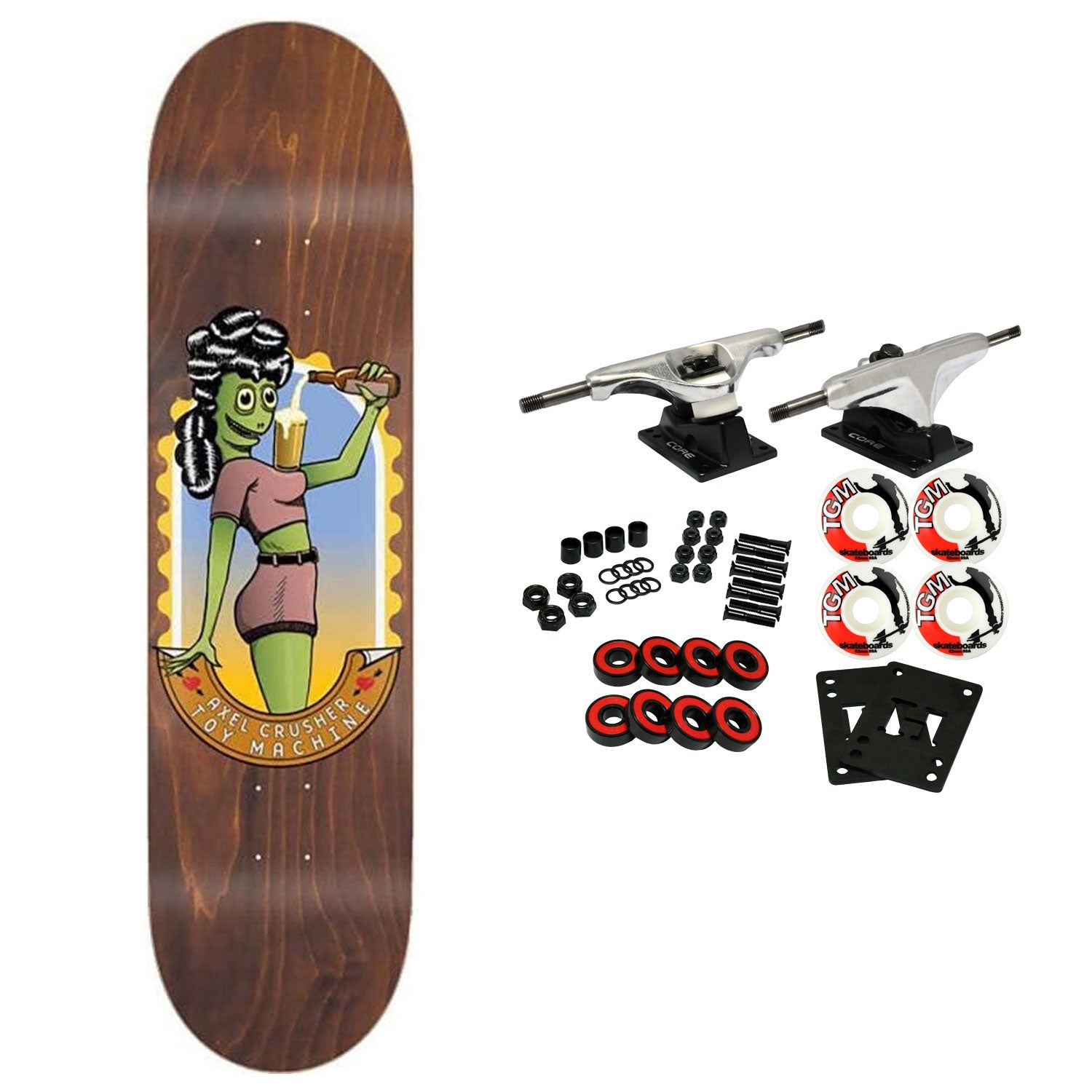 Toy Machine Skateboard Deck Axel Brew. Comes with Core trucks, 52mm TGM logo wheels, Amp abec 5 bearings, Black Diamond Griptape, risers, and hardware. Core trucks are light weight and feature heavy duty aluminum with grade 8 steel kingpins and axles, as well as USA made bushings and pivot cups. 52mm 99A are the perfect wheels for both street and park skating. Like the name states, Amp bearings are stimulants for your wheels! Light synthetic oil, Delrin Crowns, and Rubber Serviceable Shields are a few of the things that makes these bearings one of the best Abec 5 rated bearings on the market. Arrives un-assembled which allows for customization and a feeling of accomplishment. Skaters love building their boards! Easy to assemble!