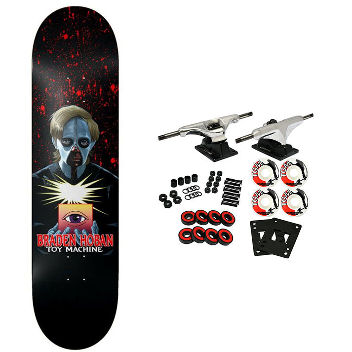 Toy Machine decks are constructed with 7-Ply North American Maple. This board measures 8.38" x 32". Comes with Core trucks, 52mm TGM logo wheels, Amp abec 5 bearings, Black Diamond Griptape, risers, and hardware. Core trucks are light weight and feature heavy duty aluminum with grade 8 steel kingpins and axles, as well as USA made bushings and pivot cups. 52mm 99A are the perfect wheels for both street and park skating. Like the name states, Amp bearings are stimulants for your wheels! Light synthetic oil, Delrin Crowns, and Rubber Serviceable Shields are a few of the things that makes these bearings one of the best Abec 5 rated bearings on the market. Arrives un-assembled which allows for customization and a feeling of accomplishment. Skaters love building their boards! Easy to assemble!