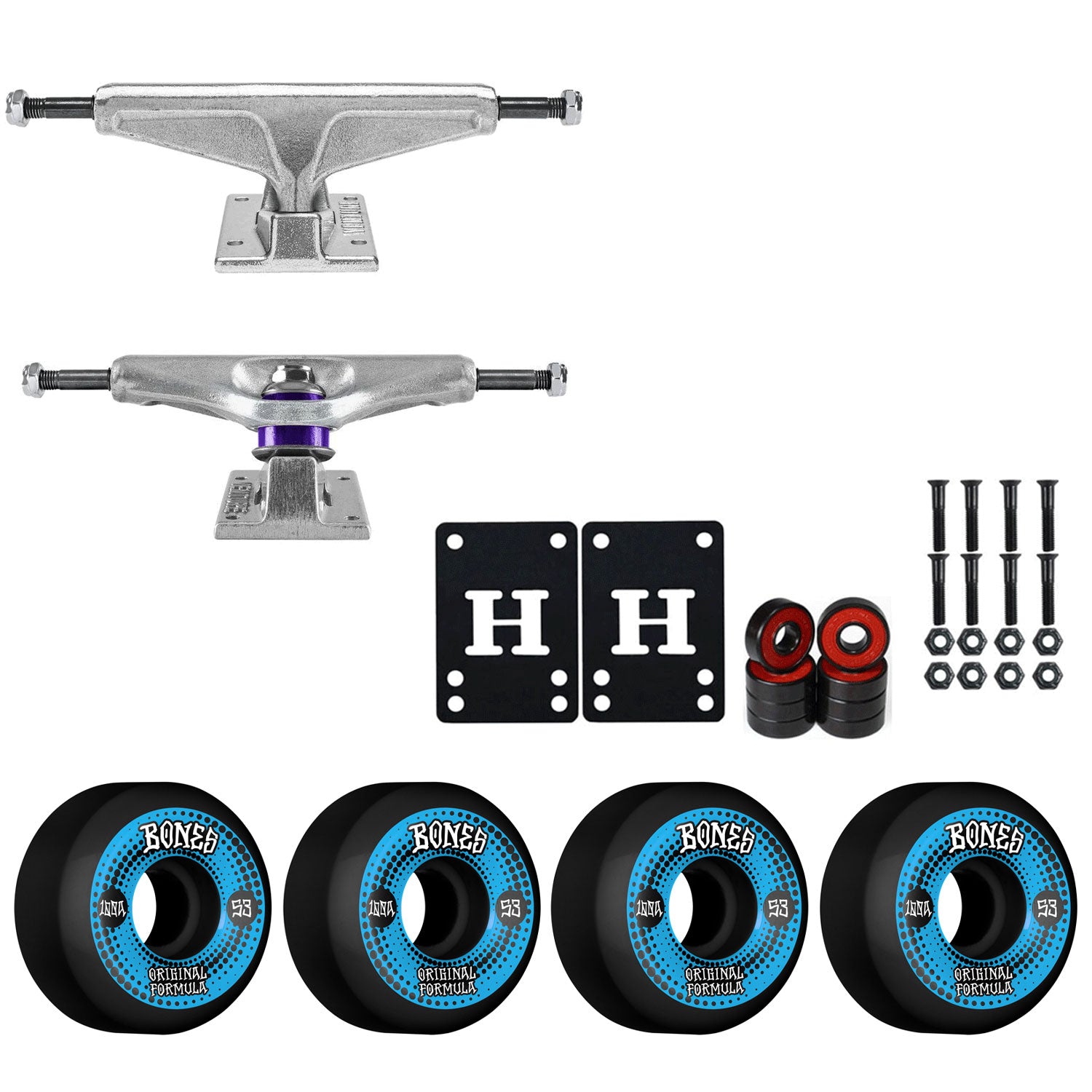 This package contains everything you need to make your deck a complete. Includes a set of Standard Polished Venture Trucks, Bones 100's Wheels, Amp Abec 5 Bearings, 1" Hardware, and 1/8" Riser pads. Just add a deck and griptape and you are ready to ride!