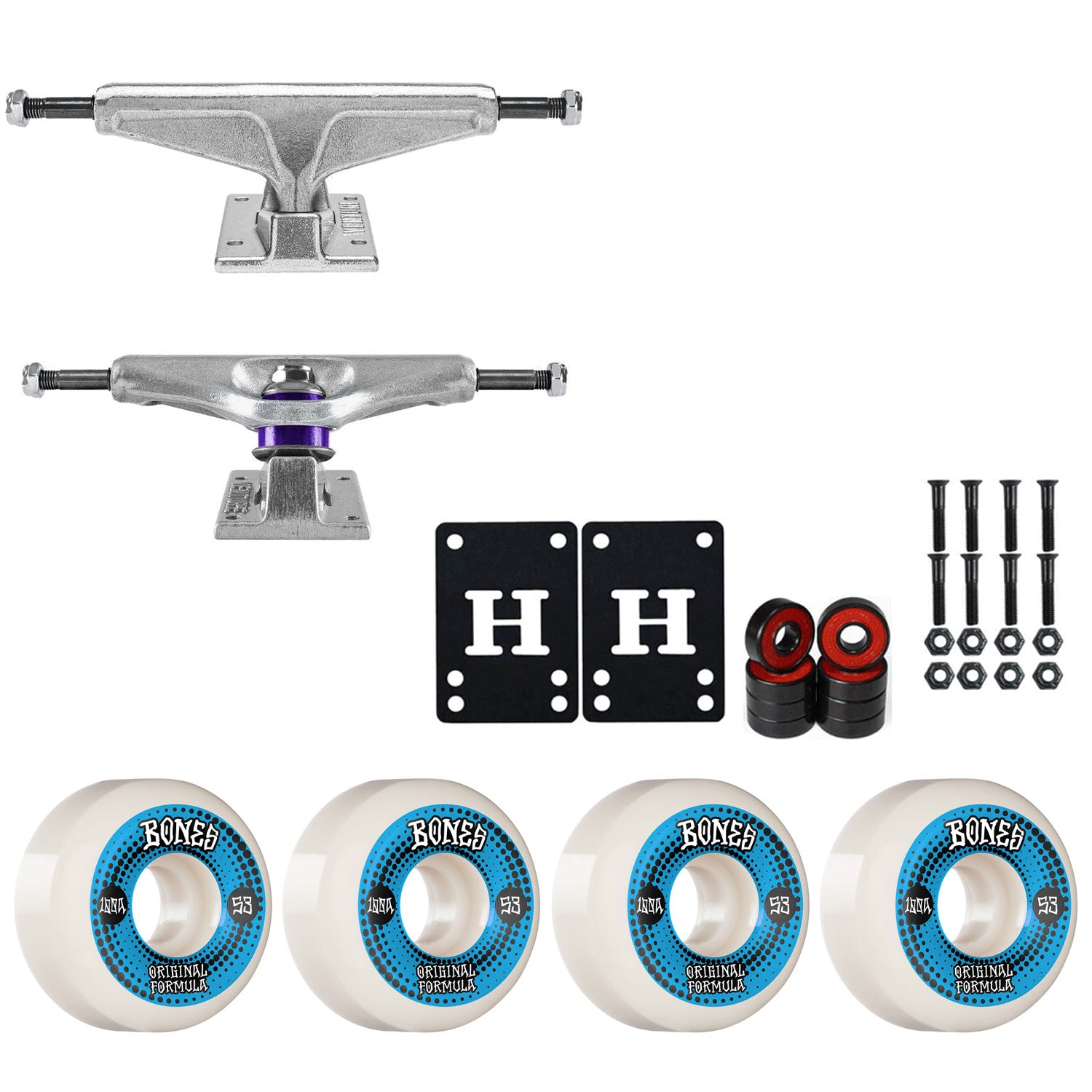This package contains everything you need to make your deck a complete. Includes a set of Standard Polished Venture Trucks, Bones 100's Wheels, Amp Abec 5 Bearings, 1" Hardware, and 1/8" Riser pads. Just add a deck and griptape and you are ready to ride!