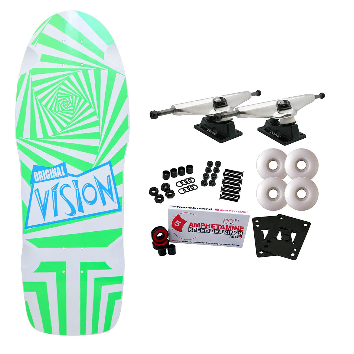 Vision classic Re-Issue made to the exact specifications of the original design and it's still being made by the same company that made them! It's hard to go wrong when the original company is the still making the board from the 80's! Measures 10" x 30" with a 16.25" wheelbase. Comes with Core trucks, 58mm 97A wheels, Amp abec 5 bearings, Black Diamond Griptape, risers, and hardware. Core trucks are light weight and feature heavy duty aluminum with grade 8 steel kingpins and axles, as well as USA made bushings and pivot cups. 58mm 97A are the perfect wheels for both street and park skating. Like the name states, Amp bearings are stimulants for your wheels! Light synthetic oil, Delrin Crowns, and Rubber Serviceable Shields are a few of the things that makes these bearings one of the best Abec 5 rated bearings on the market. Arrives un-assembled which allows for customization and a feeling of accomplishment. Skaters love building their boards! Easy to assemble!