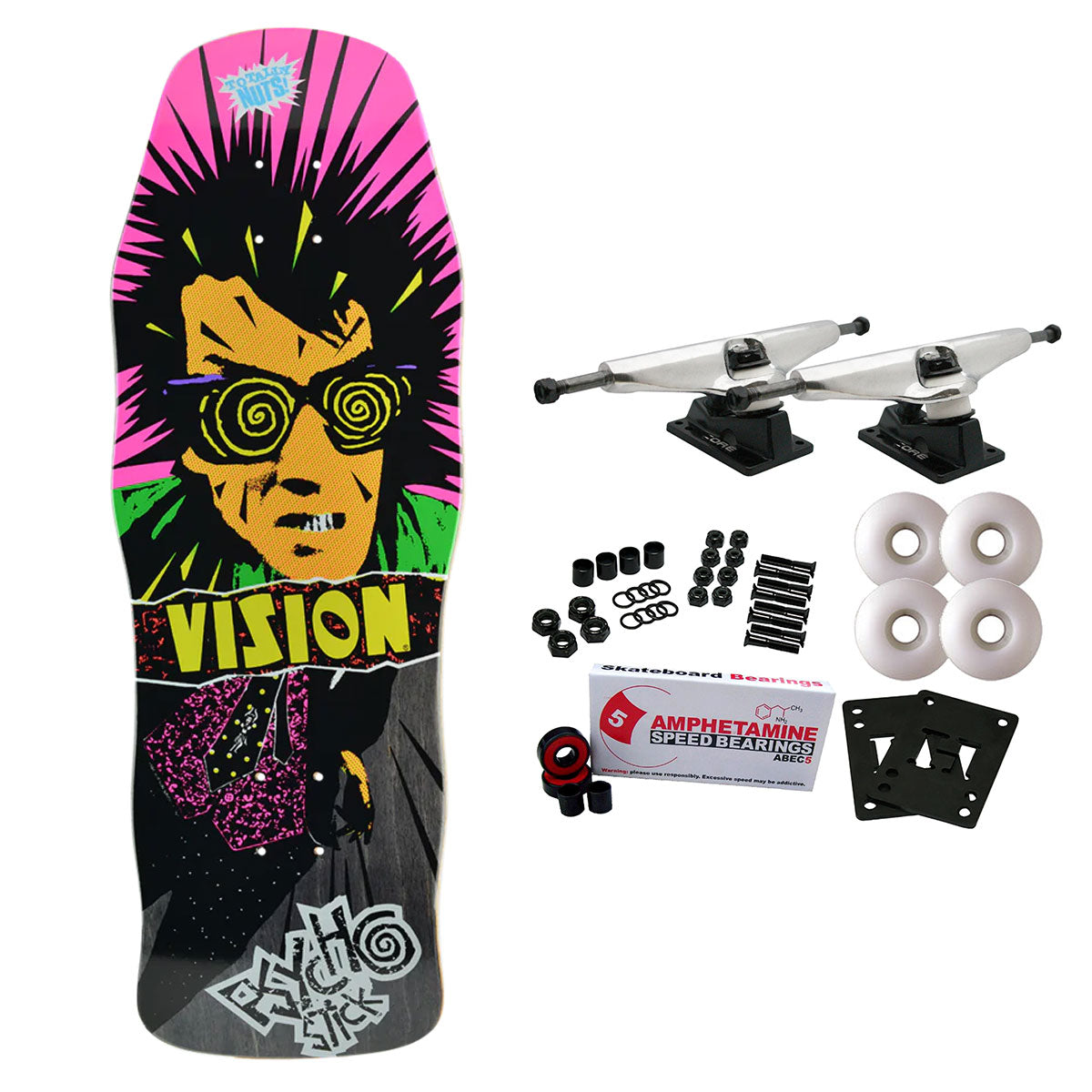 Vision classic Re-Issue made to the exact specifications of the original design and it's still being made by the same company that made them! It's hard to go wrong when the original company is the still making the board from the 80's! Measures 10" x 30" with a 15.375" wheelbase. Comes with Core trucks, 58mm 97A wheels, Amp abec 5 bearings, Black Diamond Griptape, risers, and hardware. Core trucks are light weight and feature heavy duty aluminum with grade 8 steel kingpins and axles, as well as USA made bushings and pivot cups. 58mm 97A are the perfect wheels for both street and park skating. Like the name states, Amp bearings are stimulants for your wheels! Light synthetic oil, Delrin Crowns, and Rubber Serviceable Shields are a few of the things that makes these bearings one of the best Abec 5 rated bearings on the market. Arrives un-assembled which allows for customization and a feeling of accomplishment. Skaters love building their boards! Easy to assemble!