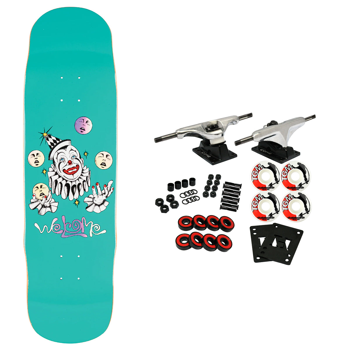 Custom shape designed and ridden by Daniel. Prismatic foil accents. 8.8" x 32.5", 14.5"Wheelbase, Rides like an 8.5" popsicle. Artwork by Jason Celaya. Comes with Core trucks, 52mm TGM logo wheels, Amp abec 5 bearings, Black Diamond Griptape, risers, and hardware. Core trucks are light weight and feature heavy duty aluminum with grade 8 steel kingpins and axles, as well as USA made bushings and pivot cups. 52mm 99A are the perfect wheels for both street and park skating. Like the name states, Amp bearings are stimulants for your wheels! Light synthetic oil, Delrin Crowns, and Rubber Serviceable Shields are a few of the things that makes these bearings one of the best Abec 5 rated bearings on the market. Arrives un-assembled which allows for customization and a feeling of accomplishment. Skaters love building their boards! Easy to assemble!