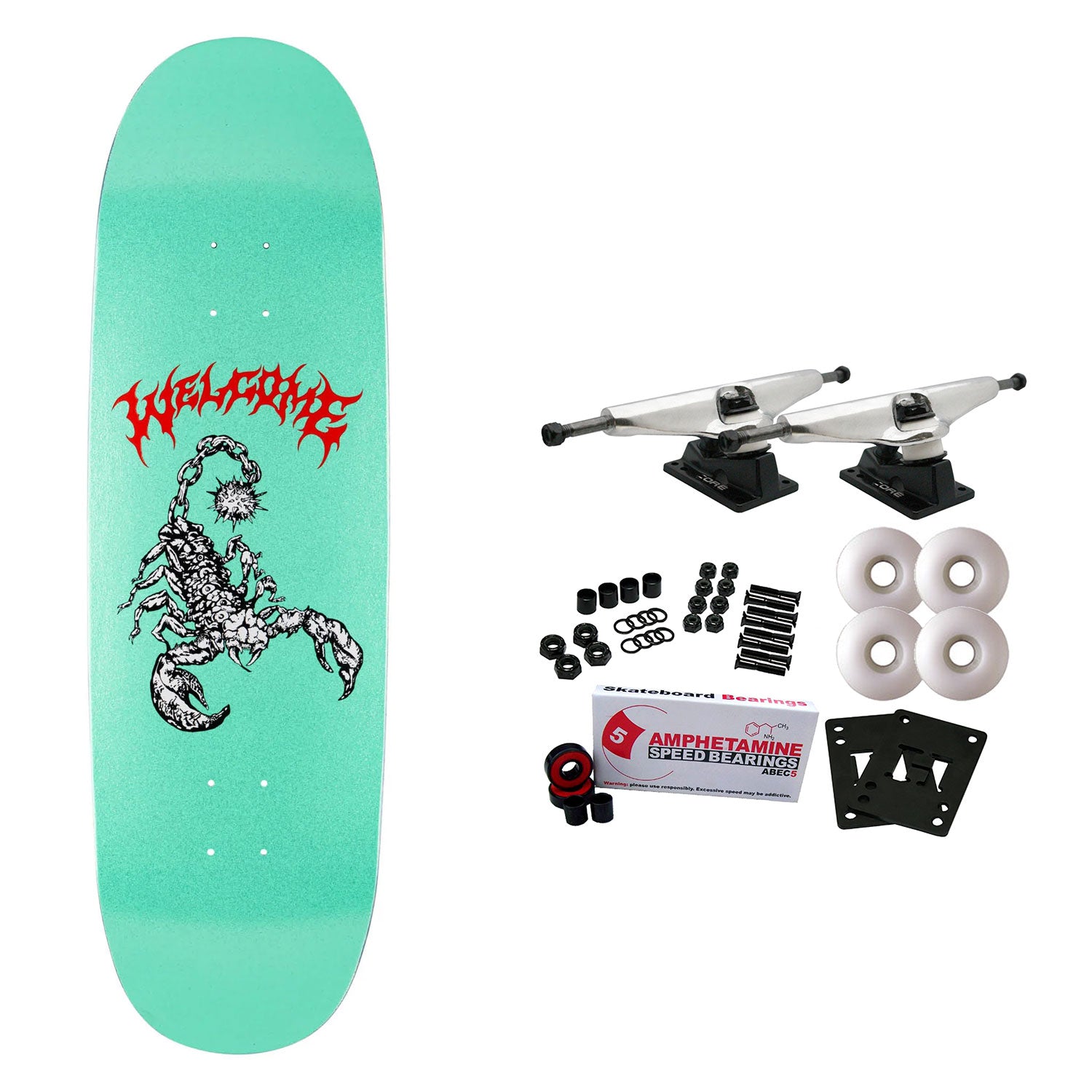 Welcome decks are produced with premium North American Maple. The perfectly-cooked egg! Now with glitter! Measures 9.5" x 33", with a 14.5" Wheelbase. Art by Jason Celaya. Comes with Core trucks, 58mm 97A wheels, Amp abec 5 bearings, Black Diamond Griptape, risers, and hardware. Core trucks are light weight and feature heavy duty aluminum with grade 8 steel kingpins and axles, as well as USA made bushings and pivot cups. 58mm 97A are the perfect wheels for both street and park skating. Like the name states, Amp bearings are stimulants for your wheels! Light synthetic oil, Delrin Crowns, and Rubber Serviceable Shields are a few of the things that makes these bearings one of the best Abec 5 rated bearings on the market. Arrives un-assembled which allows for customization and a feeling of accomplishment. Skaters love building their boards! Easy to assemble!