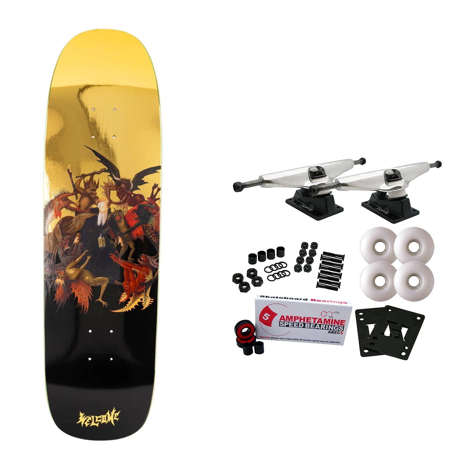 Welcome decks are produced with premium North American Maple. This graphic features gold foil. Measures 9.25" x 32.6", with a 14.75" Wheelbase. Comes with Core trucks, 58mm 97A wheels, Amp abec 5 bearings, Black Diamond Griptape, risers, and hardware. Core trucks are light weight and feature heavy duty aluminum with grade 8 steel kingpins and axles, as well as USA made bushings and pivot cups. 58mm 97A are the perfect wheels for both street and park skating. Like the name states, Amp bearings are stimulants for your wheels! Light synthetic oil, Delrin Crowns, and Rubber Serviceable Shields are a few of the things that makes these bearings one of the best Abec 5 rated bearings on the market. Arrives un-assembled which allows for customization and a feeling of accomplishment. Skaters love building their boards! Easy to assemble!