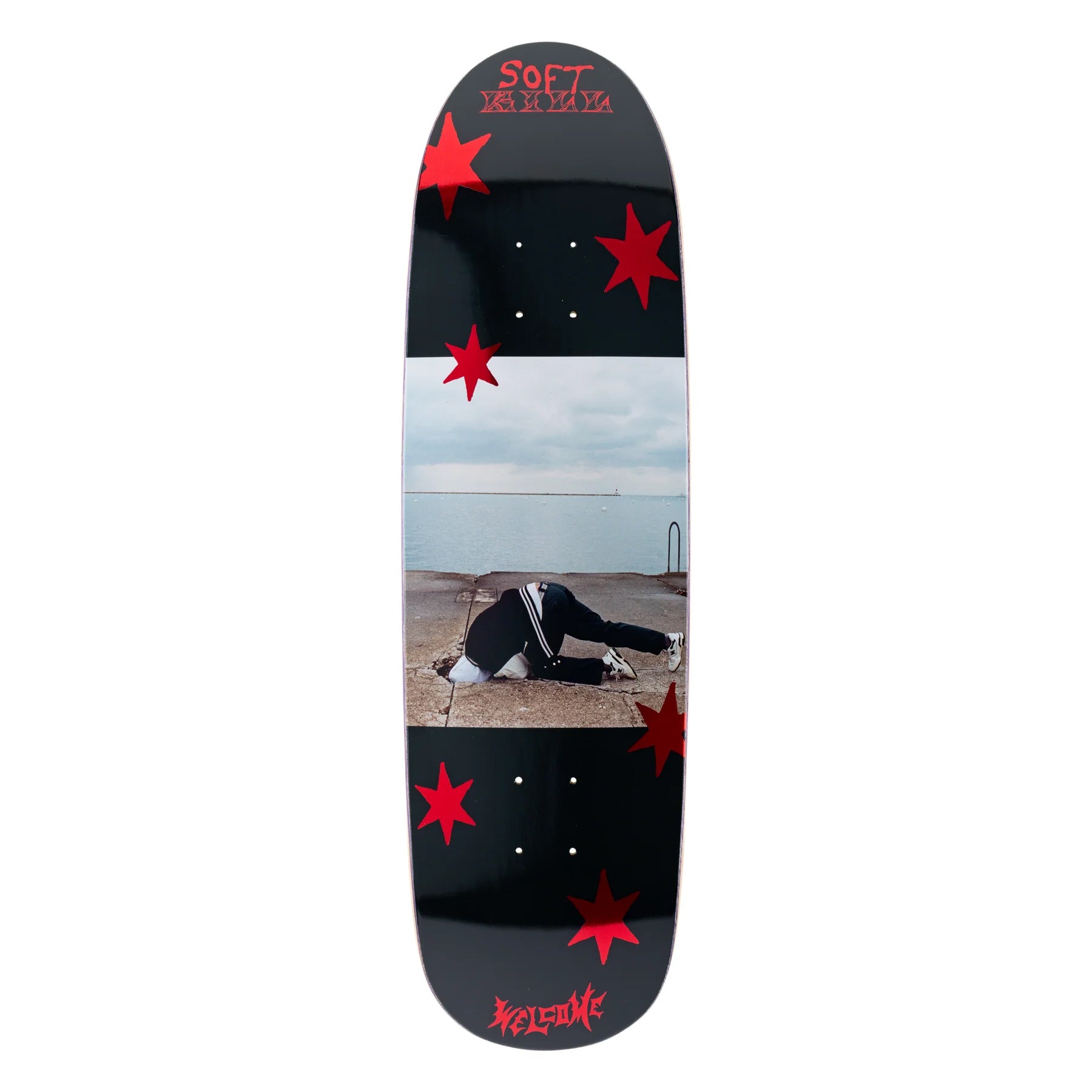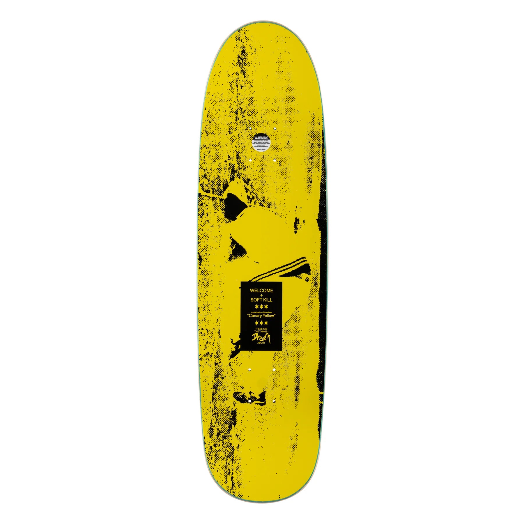 Welcome decks are produced with premium 7-Ply North American Maple. 8.8" x 31.75". 14.0" Wheelbase. Authentic early 90s-style football/egg shape. Rides like an 8.5" popsicle. Official limited collaboration with the legendary Soft Kill, in celebration of their incredible new full-length album, "Canary Yellow.